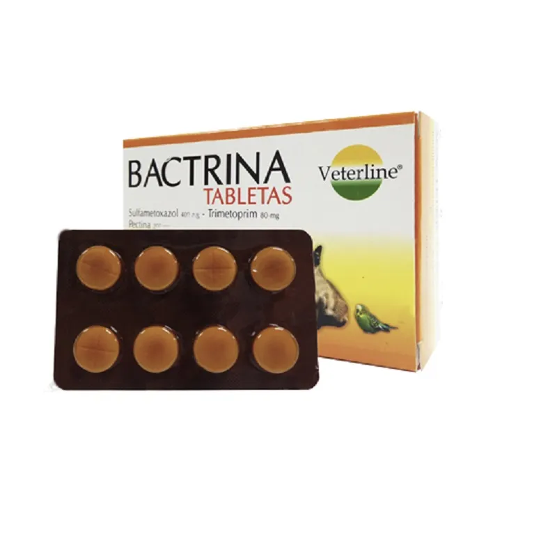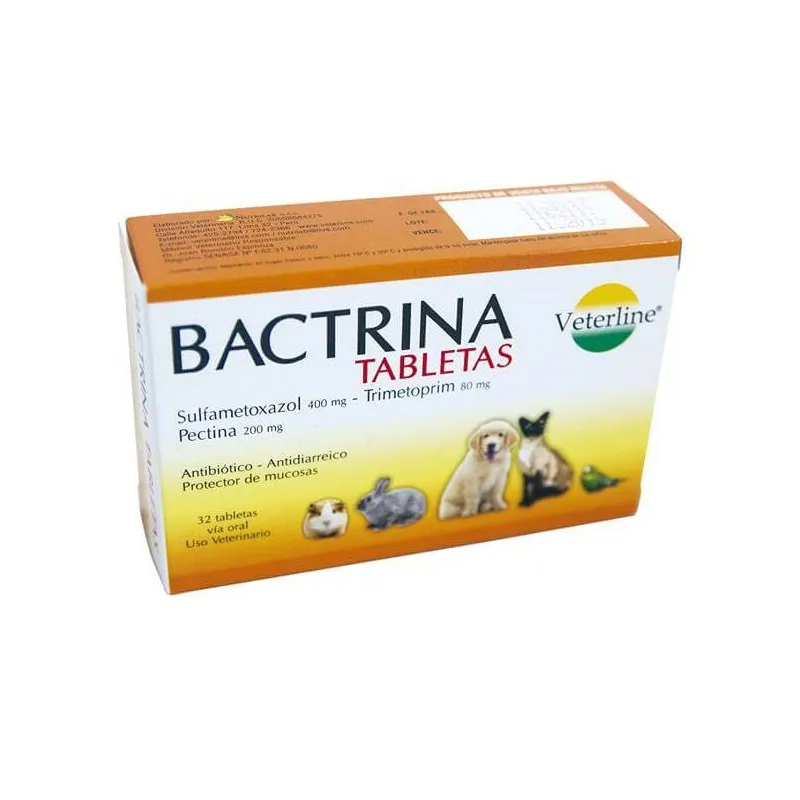 BactrinaTableta es antibiótica de amplio espectro de uso oral para el tratamiento de diarreas de origen infeccioso, con pectina; un excelente protector de mucosa, capaz de absorber y eliminar las toxinas producidas por las bacterias causantes de gastroenteritis y colitis, además actúa como regulador de la fibra bacteriana normal del intestino. Tratamiento de los principales problemas infecciosos del tracto gastrointestinal (gastroenteritis), causado por gérmenes sensibles a los principios activos de la formulación, gram positivo y gram negativo, infecciones primarias y secundarias del tracto respiratorio (sinusitis, bronquitis), infecciones genitourinarias (piometra, cistitis, vaginitis, prostatitis), meningitis, microsporidiasis, coccidiosis, toxoplasmosis, en profilaxis antimicrobiana en pacientes inmunosuprimidos y en complicaciones bacterianas en la fase inical del distemper canino. En caso de coccidiosis en conejos, cuyes y aves ornamentales.