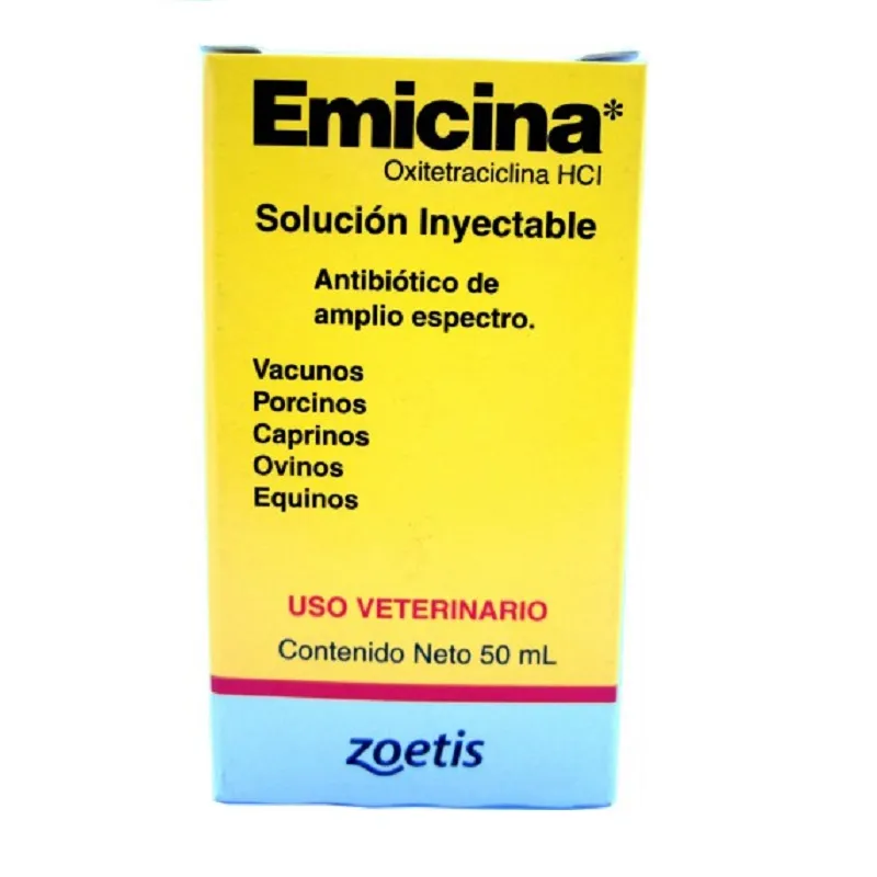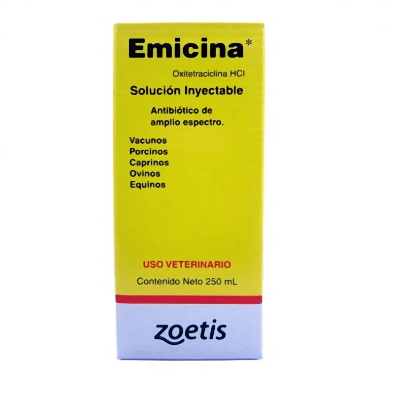 Emicina simple, es un antibiótico de amplio espectro en solución inyectable, estable, lista para ser utilizada, que contiene 50 mg de Terramicina* (Oxitetraciclina Pfizer) por mililitro. El vehículo utilizado (propilenglicol) permite una perfecta y total disolución del principio activo y total absorción en el punto de inyección sin provocar lesión.