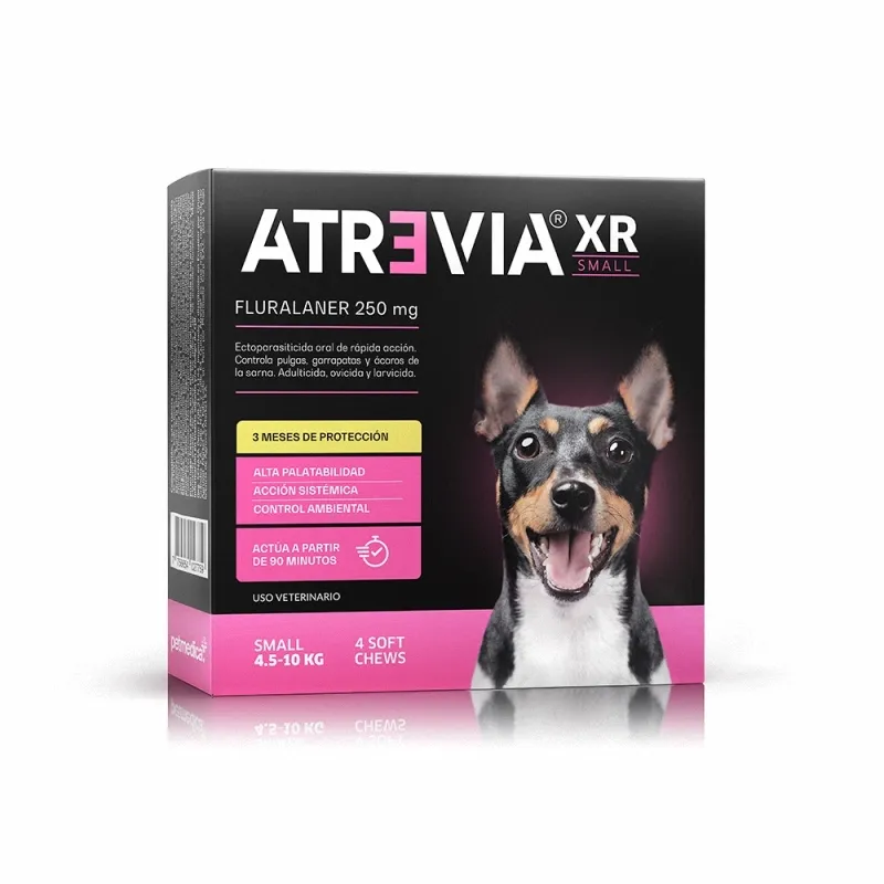 Atrevia XR Small es para el control de infestaciones de los principales ectoparásitos en perros (garrapatas, pulgas y ácaros) durante 12 semanas.