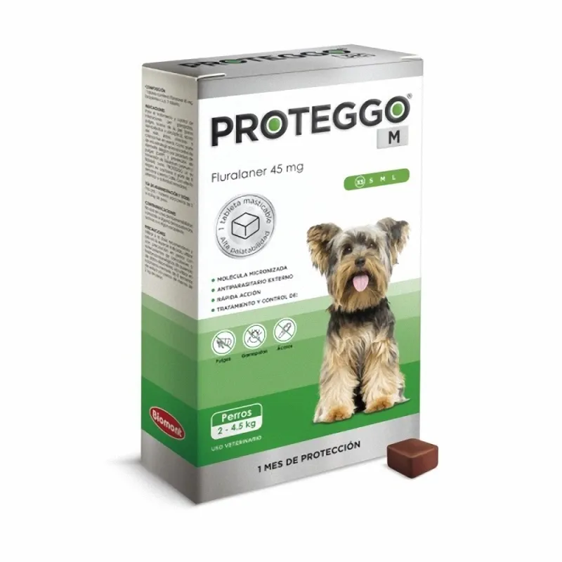 Protego M 2-4.5 kg. Está indicado para el tratamiento y control de las infestaciones producidas por garrapatas, pulgas y ácaros en perros, proporcionando una acción sistémica y actividad inmediata, durante por los menos 30 días.