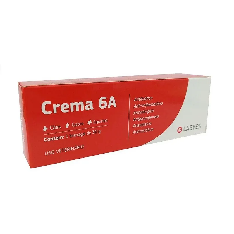 Crema 6A es un producto de uso dermatológico para perros y gatos con el beneficio de 6 acciones: Antiinflamatoria, Antibiótica, Antimicótica, Anestésica, Antialérgica y Antipruriginosa.