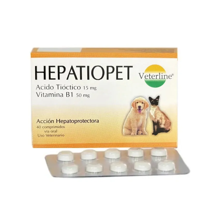 Hepatiopet tabletas es el Ácido Tióctico tiene una potente acción hepatoprotectora, antitóxica, actuando como quelante de los metales pesados y promoviendo la regeneración del hepatocito más rápidamente, también es uno de los antioxidantes naturales más potentes que se conocen, gracias a esto además de captar radicales libres, mejora la función cerebral de los perros viejos que padecen el síndrome de disfunción cognitiva. Es recomendable también en pacientes diabéticos, con afecciones dermatológicas como urticaria y otras dermatosis de origen alimenticio y pacientes bajo tratamiento oncológico.