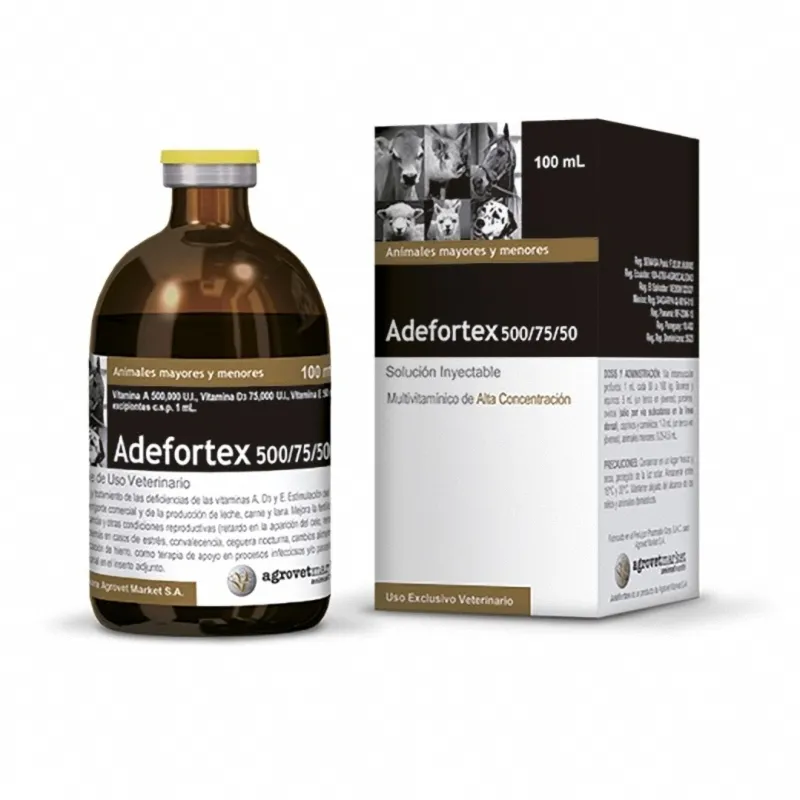 Adefortex 500/75/50 x 100 ml es una asociación vitamínica en alta concentración de las vitaminas A, D3 y E. para prevención y tratamiento de deficiencias vitamínicas. crecimiento, engorde y producción de leche, carne y lana.
