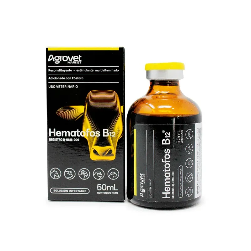 Hematofos B12 x 50 ml, Complejo hematínico, reconstituyente y tónico general en solución inyectable. Combina diversos elementos hematopoyéticos, estimulantes del apetito, oligoelementos, antianémicos, aminoácidos, vitaminas, hepatoprotectotes y a diferencia de otros productos similares en el mercado, incluye fósforo en su formulación (bajo la forma de glicerofosfato de sodio; lo cual le agrega una acción tonificante y estimulante del metabolismo mucho más pronunciada), así como una gama compleja de vitaminas del complejo B.